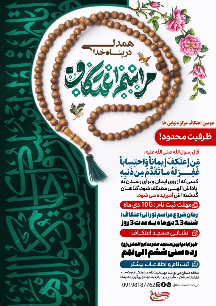 ▫️زمان : ورود به مسجد جمعه ۱۲ دی ماه ساعت ۹ صبح و خروج از مسجد دوشنبه ۱۵ دی ماه بعد از اذان مغرب و عشاء
