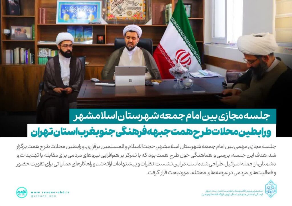 🔸جلسه مجازی بین امام جمعه شهرستان اسلامشهر و رابطین محلات طرح همت جبهه فرهنگی اجتماعی جنوبغرب استان تهران